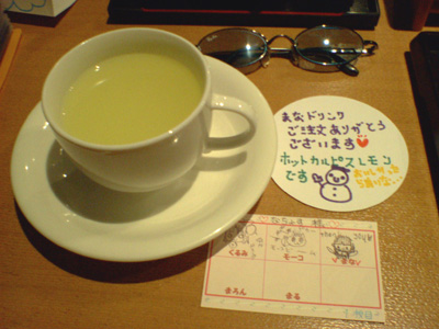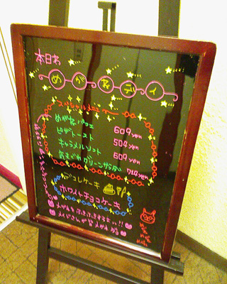 カウンターが8席、テーブルが3卓(2席)あわせて14席。内装は、カフェというより定食屋さん(吉野家的な・・・、おっと失礼w)って印象を受けた。店内は採光性も良く非常に明るい。多分まだ始まったばかりで、内装が間に合わなかったのかちょっと殺風景。1枚CLAMPの絵がはってあるくらい。