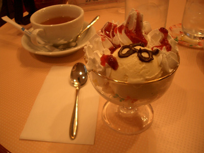 バニラとチョコのアイスが2つ。下にはパンケーキとかケーキスポンジの類が敷き詰められていた。パフェというとコーンフレークを敷き詰める場合が多いのですが、これは中々いいね。