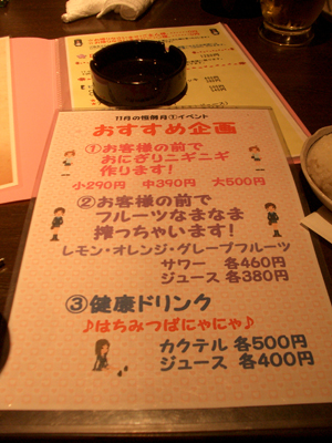 いやぁ、さすが森永氏です。確かに厳密な定義で見た場合のメイド喫茶はプリム1軒。ちなみにお酒が主体になってるかどうかという観点で分けた場合には、メイドカフェが2軒、メイドバーが3軒、メイド居酒屋が1軒、めいど模擬店(笑)が1軒です。