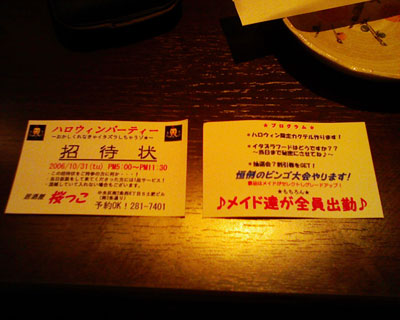 桜っこでは、10月中旬頃から夜の部でこの招待状を渡していました。写真左側が表、右側が裏です。