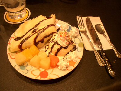 クレープは、チョコレートソースと生クリーム。フルーツがバナナとかトロピカルなフルーツ。そしてアイスクリーム。