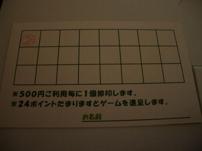500円につき1ポイント。20ポイントで1枚を満了し、ステキなオリジナルグッズと換える事が出来るそうな。