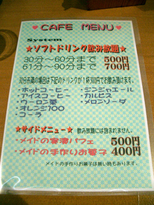 先日、メイドさんに詳細を確認したところ、アイス(バニラ、チョコ、抹茶)、アイスコーヒー、ホットコーヒーの5つから1つサービスなのだそう。